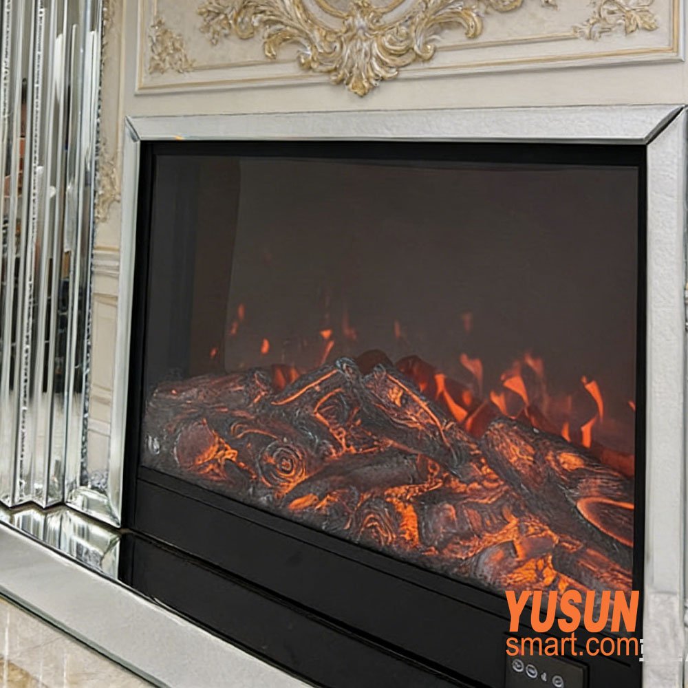 YUSUNSMART French style electric fireplace cabinet features 3D flame effect & mirrored glass finish. Ideal for living room, study, hotel, office. Elegant European minimalist design with silver/brown options.