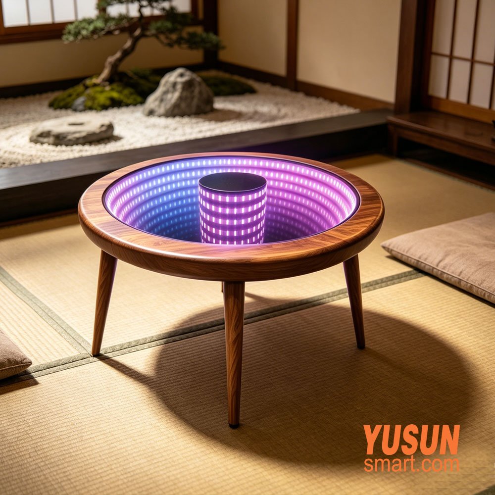 Luxurious abyss coffee table, round RGB LED infinity mirror table in Japanese-style room YUSUNSMART