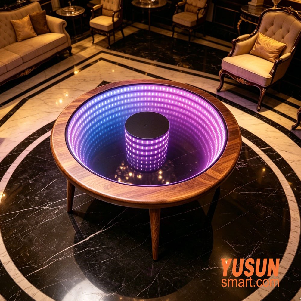 Transform any entertainment or living space with the YUSUNSMART luxurious abyss coffee table – a masterful blend of modern technology, premium craftsmanship, and opulent design. This cutting-edge infinity mirror table features a mesmerizing deep-tunnel visual effect, powered by dynamic RGB LED lighting, making it the ultimate statement piece for high-end venues and luxury homes alike.