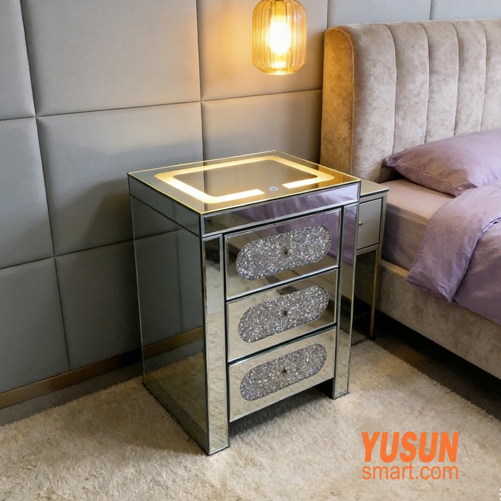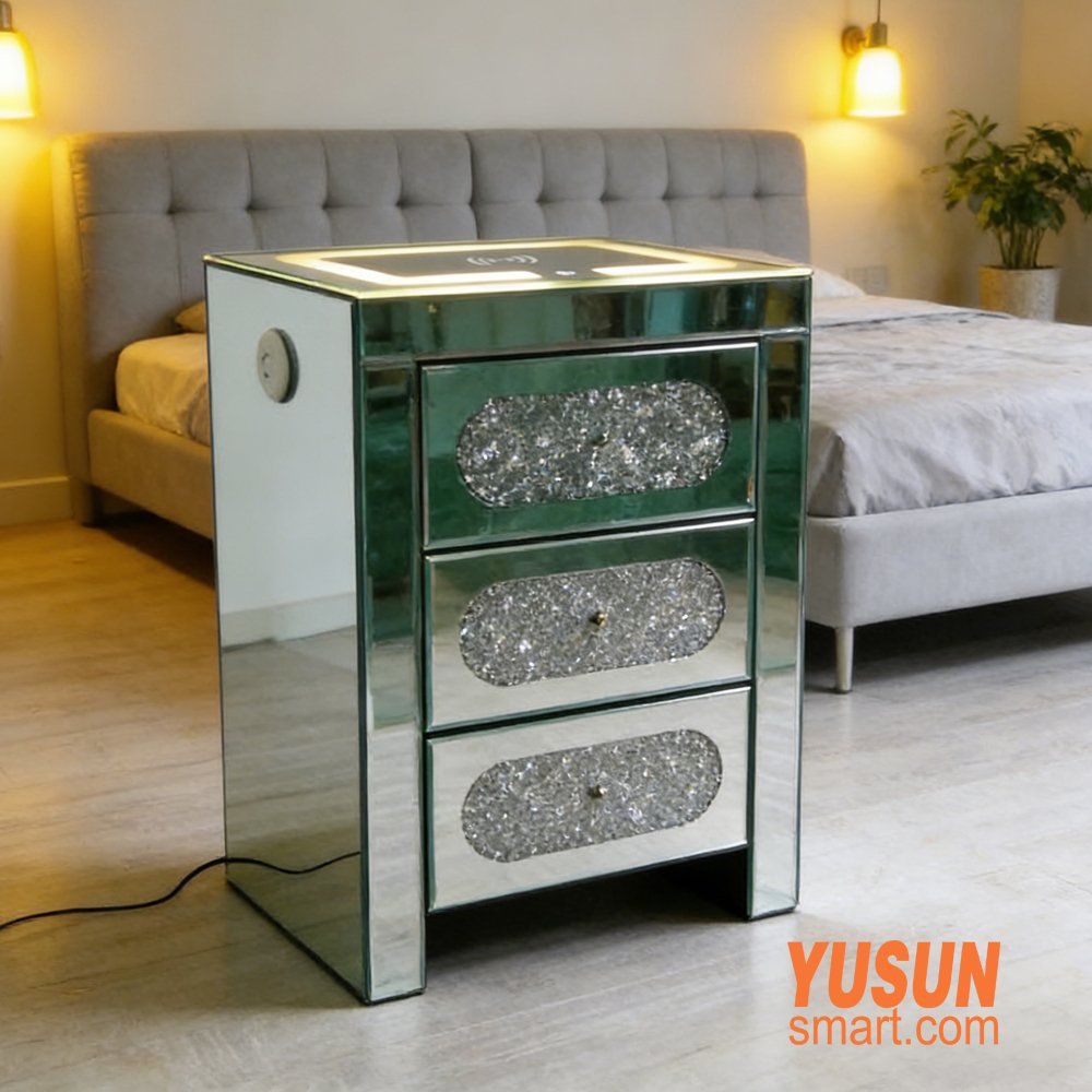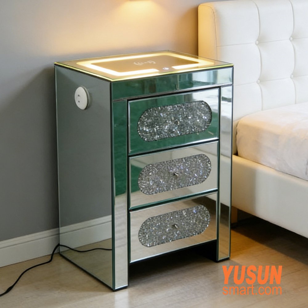 This premium mirrored bedside cabinet features dazzling water crystal diamond inlays, soft LED ambient lighting, and a built-in wireless charging pad, combining luxury decor with smart daily use.