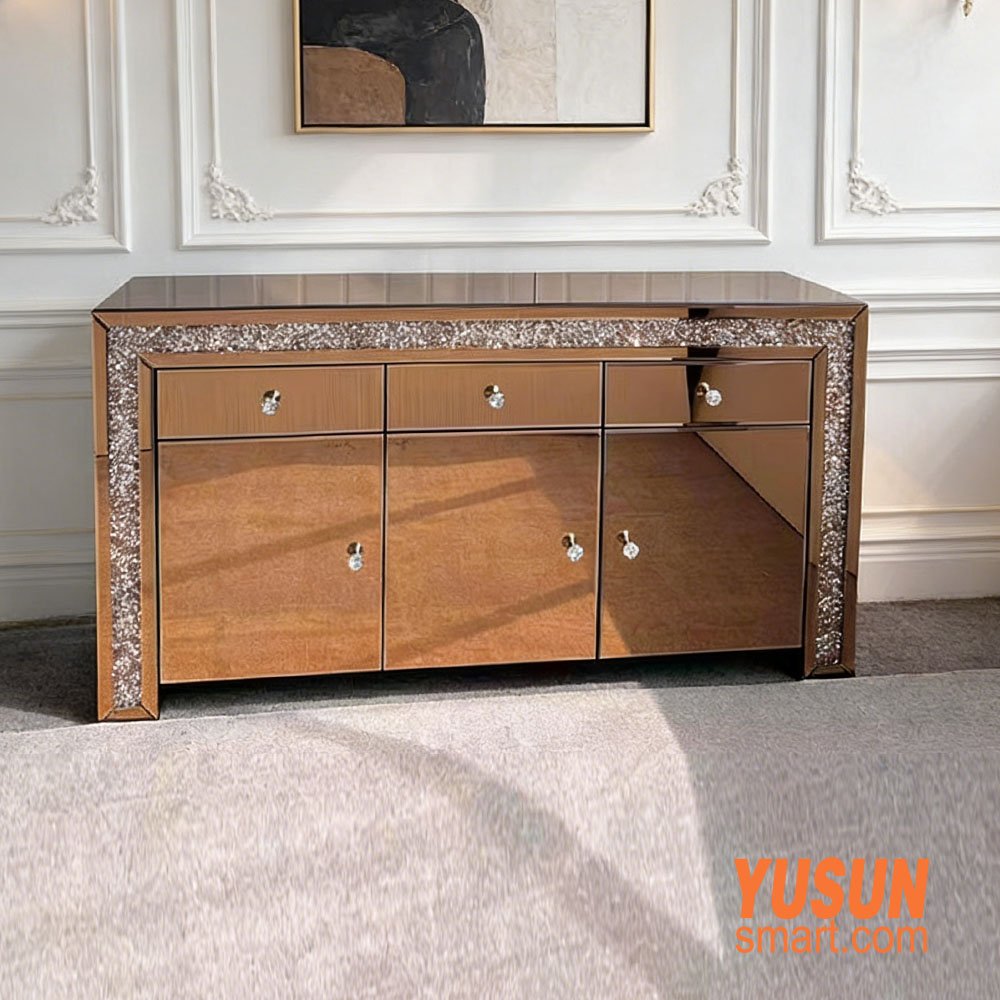 One of the key advantages of our Luxury Mirror Side Cabinet is its generous storage space. It features multiple drawers and cabinets that allow you to organize daily necessities, tableware, decorations, and other household items neatly. The soft-close hinges and smooth sliding drawers ensure quiet and convenient use every day. Unlike ordinary storage furniture, this mirrored cabinet not only hides clutter but also enhances the overall aesthetic of your interior design. It works well as a buffet cabinet, sideboard, console table, or entryway cabinet.