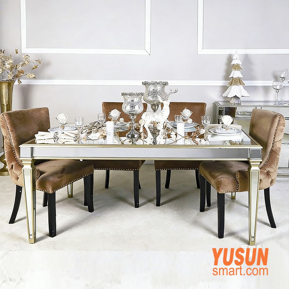 At YUSUNSMART, we specialize in European-style mirror furniture and smart home solutions, bringing luxury and functionality to homes worldwide. Our luxury mirrored dining table gold stands out for: