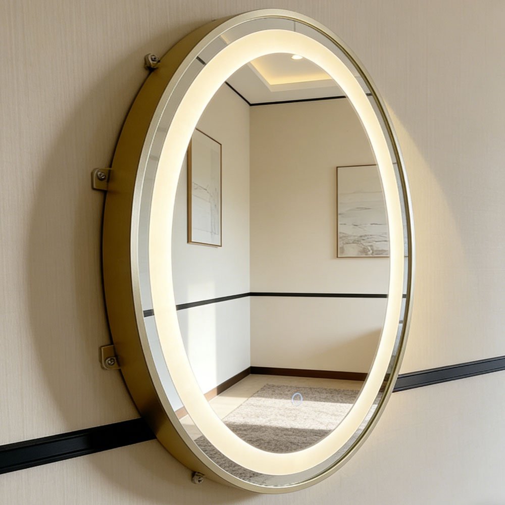 Crafted with 5mm high-quality silver mirror glass, 12V low-voltage LED strips, and a durable gold stainless steel frame, our oval smart bathroom mirror delivers crystal-clear reflection and long-lasting performance.